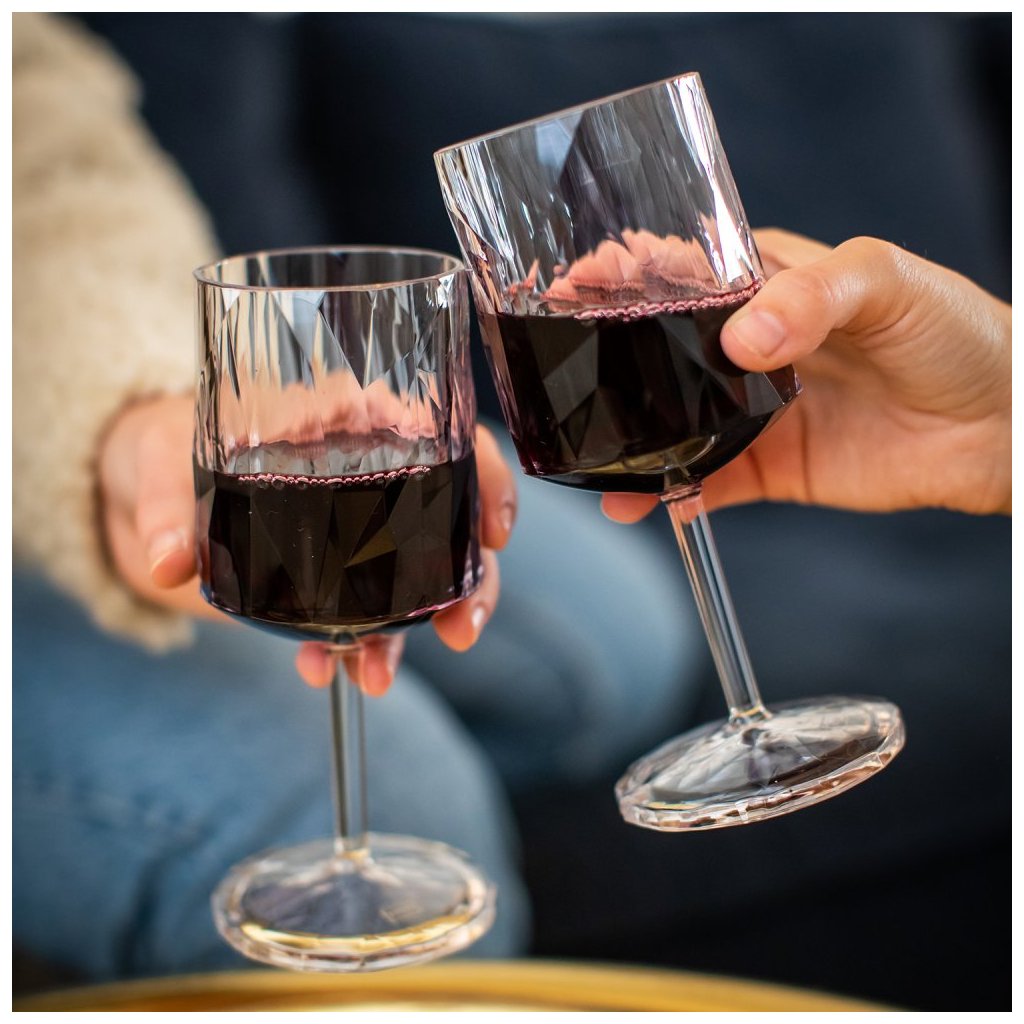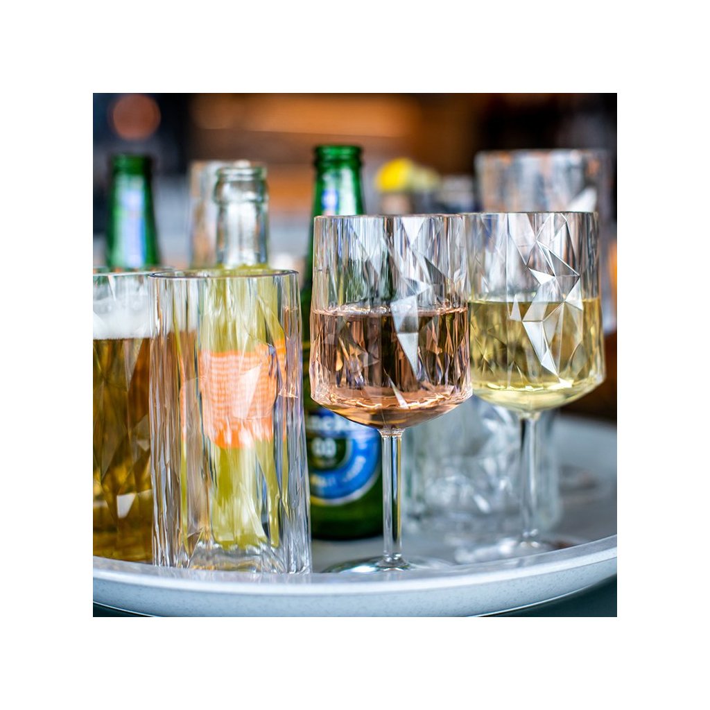 Sebbene sia realizzato in plastica trasparente, ha un aspetto molto elegante grazie alla qualità e alla consistenza del materiale che ricorda il cristallo. I bicchieri da vino CLUB non solo hanno un aspetto raffinato e si sentono bene in mano, ma sono anche praticamente indistruttibili e non si graffiano né si frantumano in caso di caduta.
