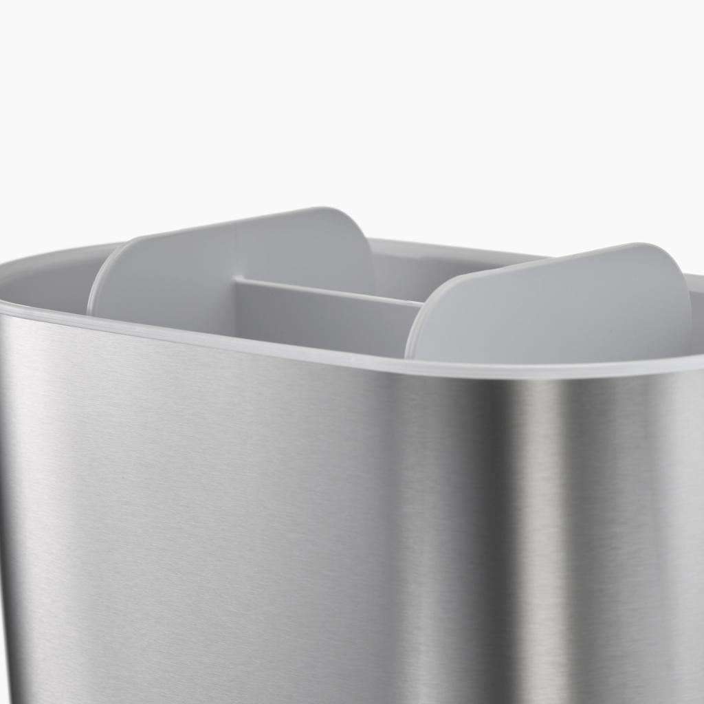 - La combinazione di una parte interna in plastica bianca e un rivestimento esterno in acciaio inossidabile crea un design pulito e a contrasto con un focus sulla funzionalità.