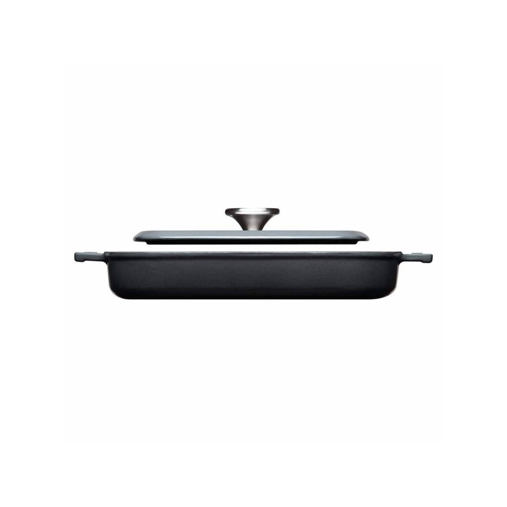 La padella Iron 24x24 cm è realizzata in ghisa, che conduce e trattiene perfettamente il calore, riducendo il consumo energetico durante la cottura. Ha un coperchio a fessura in ghisa unico nel suo genere, più piccolo della padella, con strisce per grigliare all'interno e che si appoggia direttamente sulla carne quando si usa la padella. La teglia Iron è adatta per essere servita direttamente dal forno alla tavola.