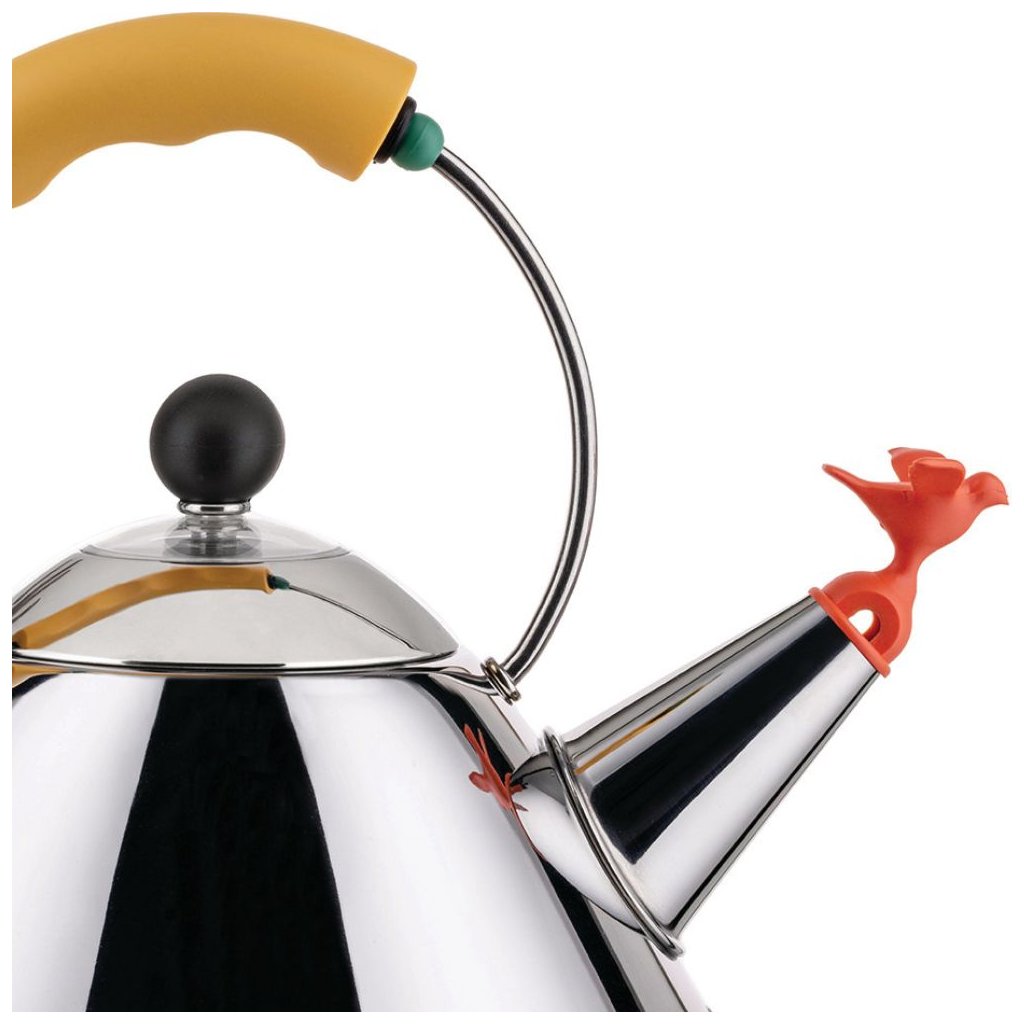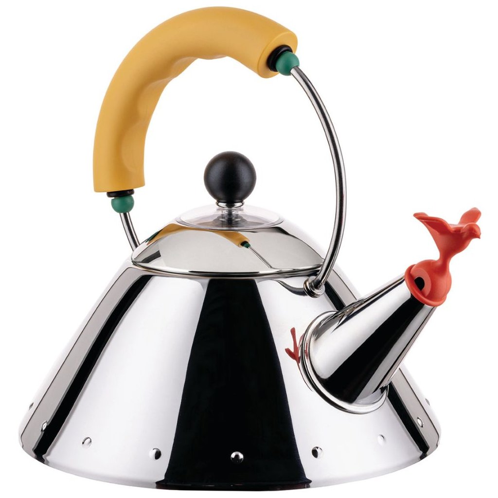 La teiera 9093 in acciaio inossidabile di alta qualità è un'icona del design industriale moderno. e uno dei prodotti più famosi di Alessi, il più venduto nella storia dell'azienda. Nel 1985, il designer Michael Graves aprì la strada al design giocoso che divenne una tendenza negli anni Novanta. Il bollitore è dotato di manico e fischietto in resina termoplastica ed è adatto a tutte le fonti di calore, compresa l'induzione.