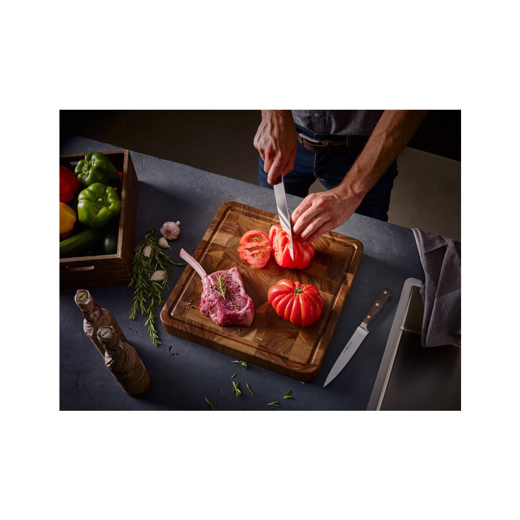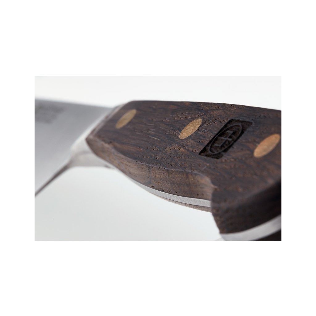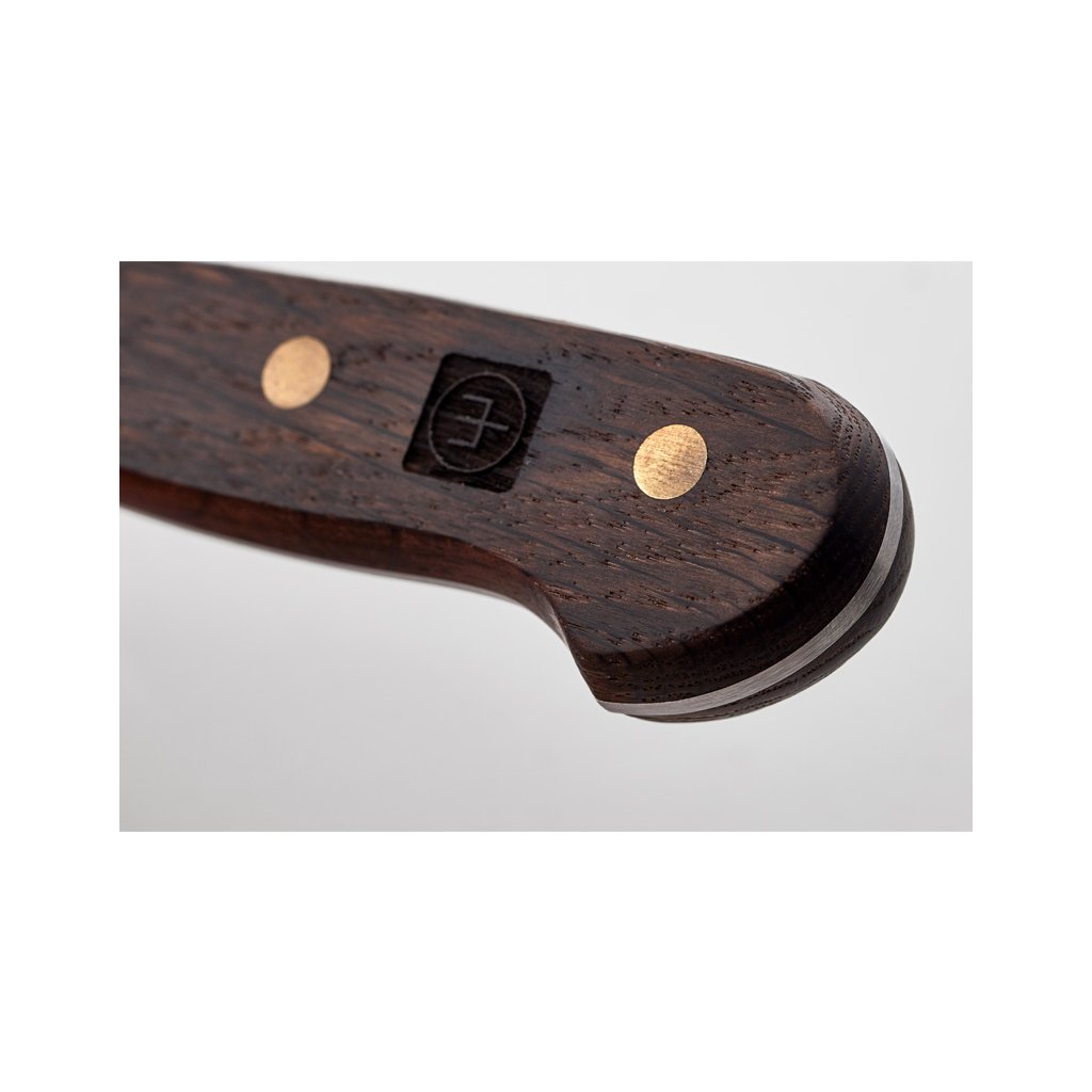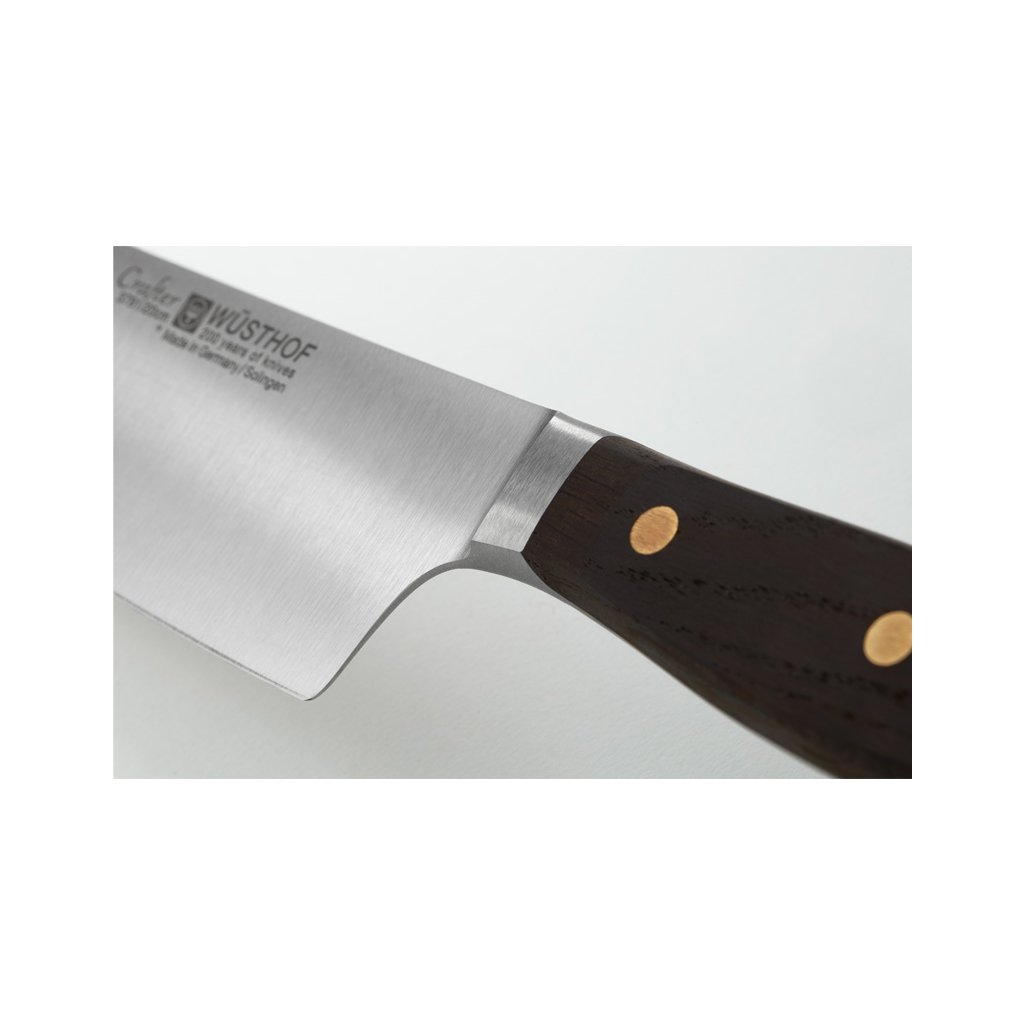 I coltelli Crafter combinano un design classico, materiali robusti, una sensazione piacevole al tatto e un utilizzo sicuro. I manici sono realizzati in massello di quercia affumicata, che li rende resistenti all'acqua e conferisce ai coltelli un carattere inconfondibile. I manici sono contrassegnati dal logo Wüsthof e sono fissati con tre rivetti in ottone. La protezione per la mano all'estremità del manico è sagomata in modo che il coltello sia sempre tenuto in modo sicuro. La testa protegge le dita, mentre l'equilibrio consente l'agilità e facilita il lavoro di precisione. La forma sottile della testa riduce il peso della lama e consente un lavoro più efficiente dal punto di vista energetico.