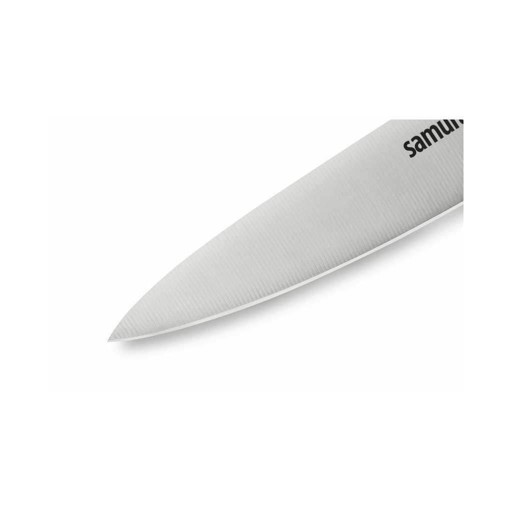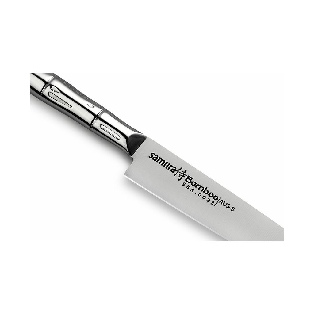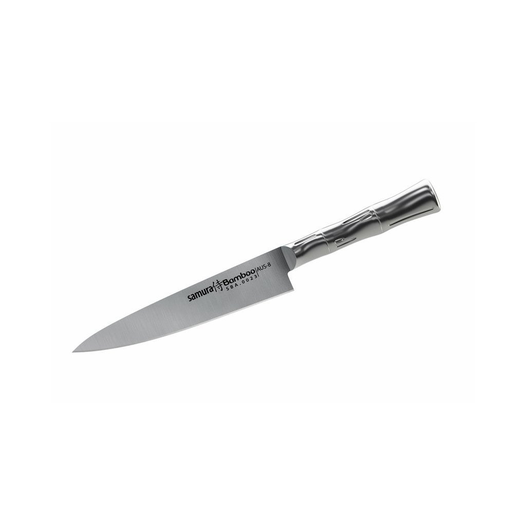 Il coltello multifunzione Samura Bamboo è perfetto per lavorare frutta, verdura, varie prelibatezze e molti altri alimenti. Grazie alla sua ampia gamma di utilizzi, è uno dei coltelli indispensabili per ogni cucina. Questo coltello ha una lunghezza e una forma accuratamente regolate, che gli conferiscono le proprietà ideali per gestire molte attività diverse, dall'affettare il pane alla preparazione di insalate. Questo coltello è realizzato in acciaio (dalla lama al manico), perfettamente bilanciato e impeccabilmente affilato. Non richiede uno sforzo eccessivo quando si affetta e mantiene a lungo la sua affilatura.