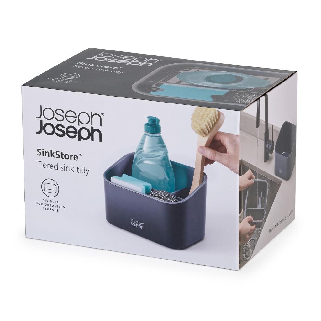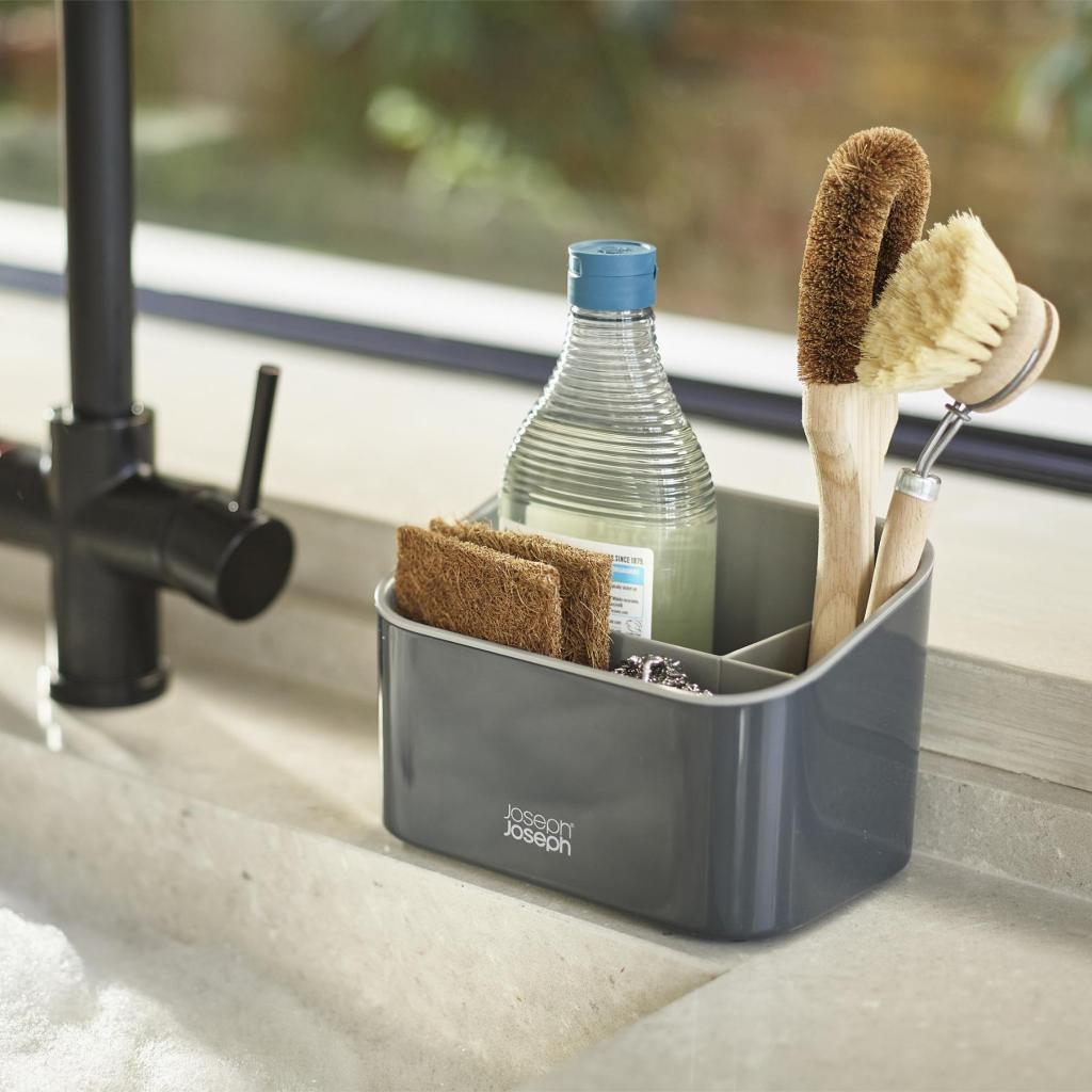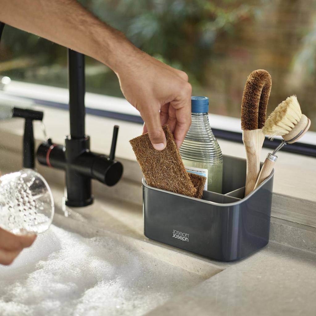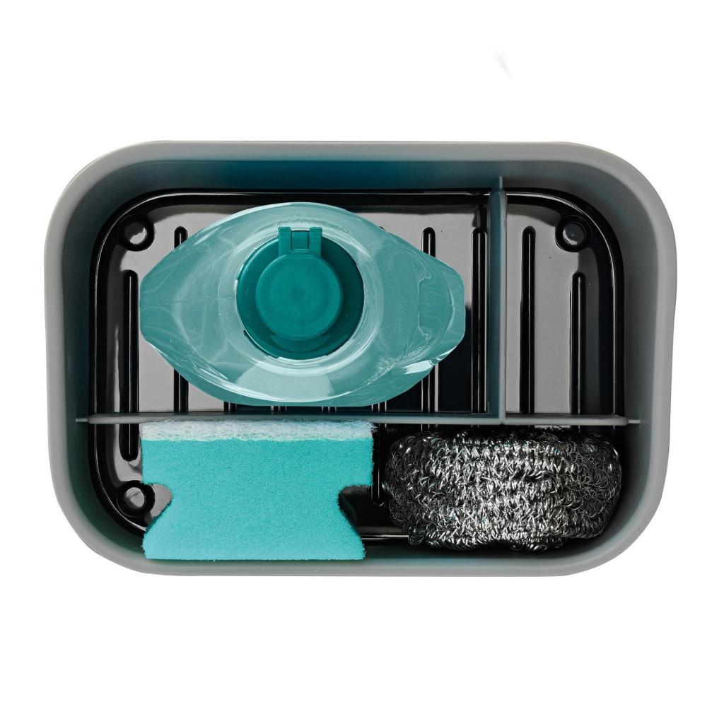 - L'ampio spazio di archiviazione è diviso in tre sezioni separate, in modo da poter separare facilmente la bottiglia di detersivo, la spazzola per piatti e le spugne o le pagliette.