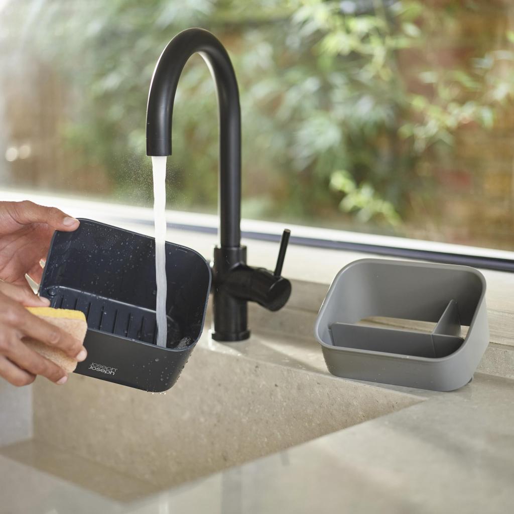 - Il bordo superiore inclinato garantisce un comodo accesso al contenuto e allo stesso tempo aiuta a raccogliere l'acqua in eccesso dalle spugne bagnate.