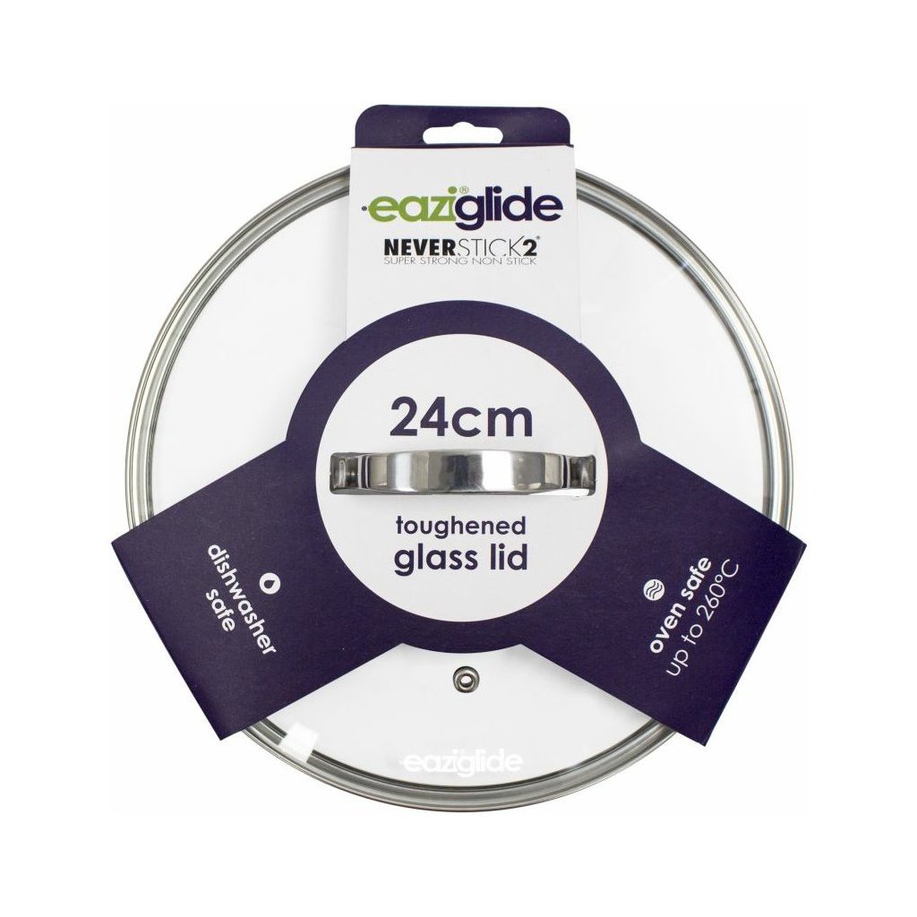 Coperchio in vetro adatto ai piatti Eaziglide Neverstick2 con diametro di 24 cm. Il coperchio è realizzato in vetro temperato e acciaio inossidabile. Utilizzate il coperchio per mantenere i cibi succosi, per la cottura a vapore per evitare che sfrigolino o per la cottura in forno.
