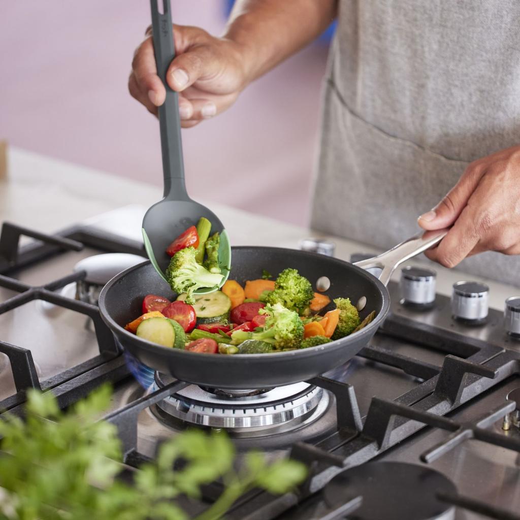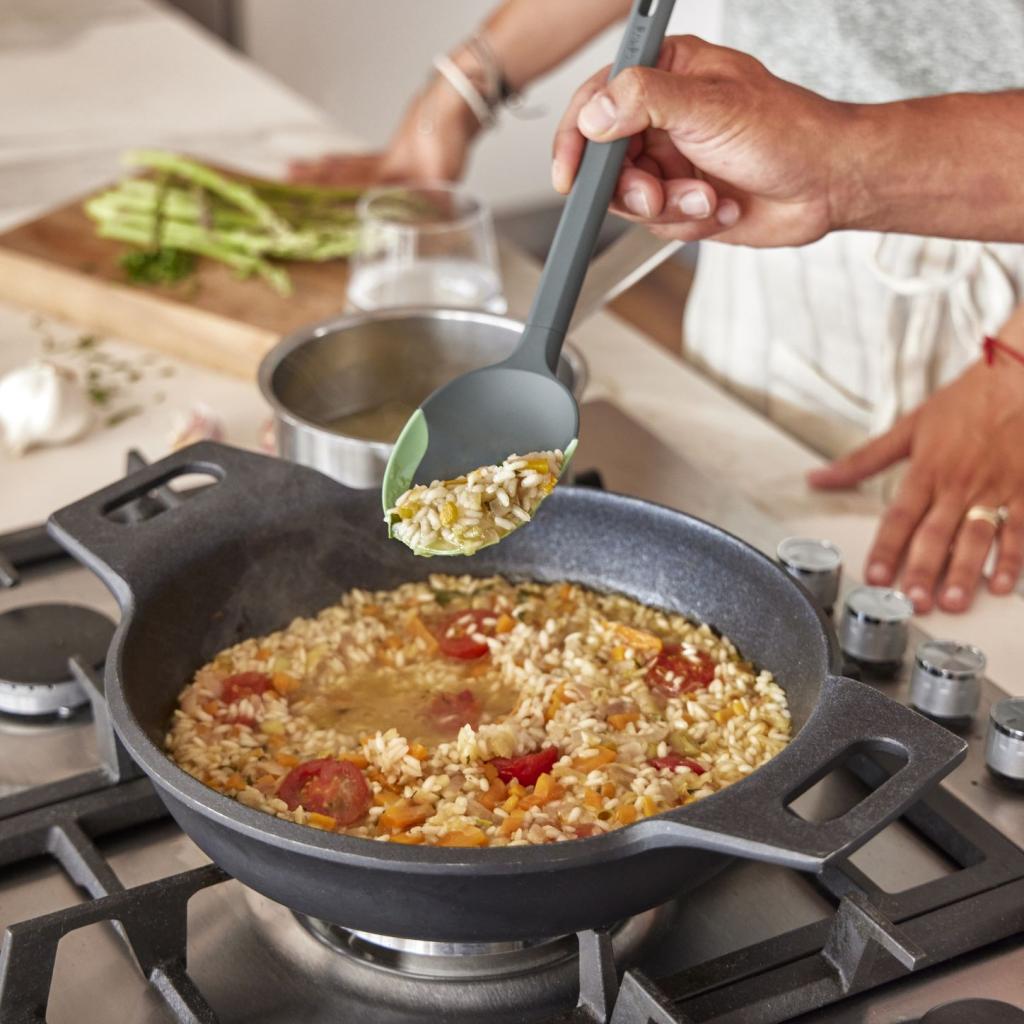 - La punta flessibile in silicone consente di raschiare perfettamente qualsiasi residuo di cibo dalla pentola, dalla ciotola o dalla padella.