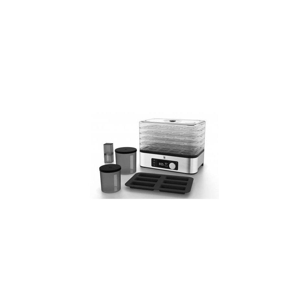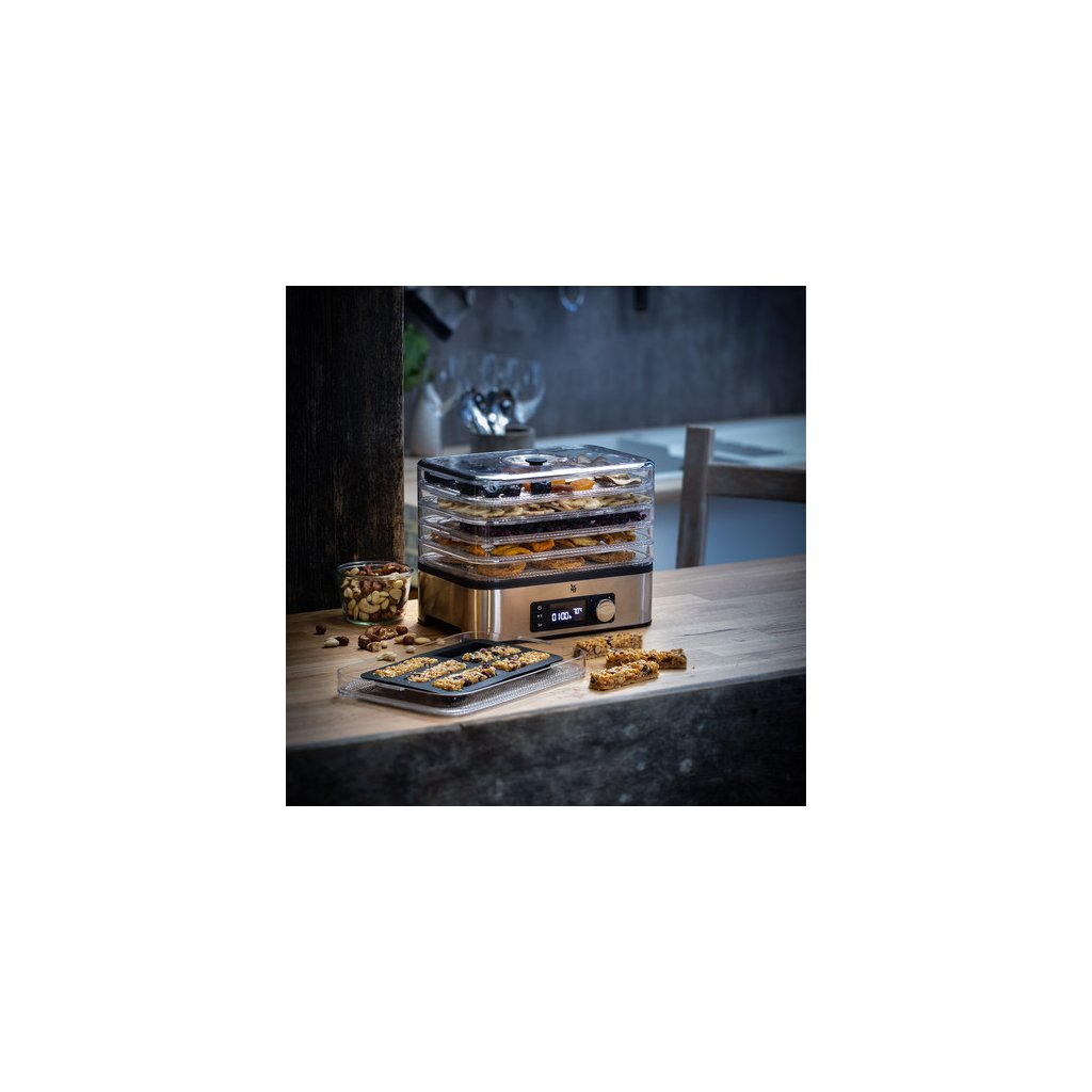 L'essiccatore della serie di piccoli elettrodomestici KITCHENminis® del marchio tedesco WMF è un modo semplice per preparare snack e frutta secca a casa. 5 livelli di vassoi di essiccazione con circolazione elettronica dell'aria essiccano efficacemente carne, frutta, verdura, funghi ed erbe. I comandi sono intuitivi. L'apparecchio è dotato di un timer di spegnimento automatico che consente di lasciare l'asciugatrice in funzione durante la notte. Gli accessori comprendono anche una formatrice di frutta o di barrette mentali e pratici barattoli per alimenti essiccati, compresa una comoda borsa da viaggio per le barrette.
