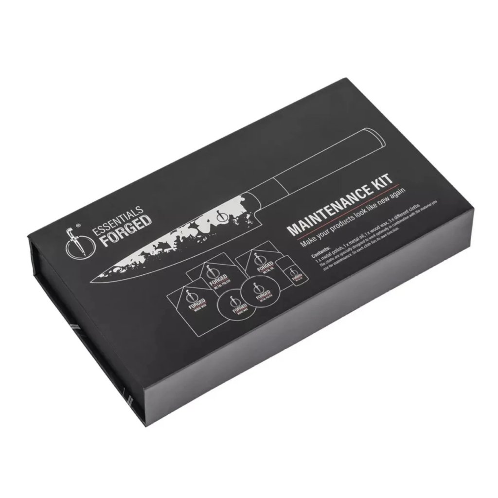 Il kit di manutenzione ESSENTIALS è come un piccolo soggiorno benessere per tutti i prodotti Forged, ma in particolar modo per i coltelli. Li trattate con cera, olio e smalto, e in cambio smettono di fare scene noiose di affettamento di pomodori. Una terapia relazionale che funziona davvero, ma senza inutili emozioni.