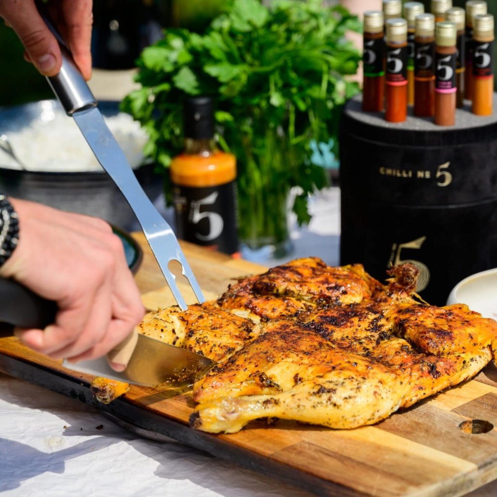 - L'etichetta nero con scritta arancione e il logo minimalista del marchio Chilli No5 conferiscono alla spezia un aspetto lussuoso e un tocco moderno.
