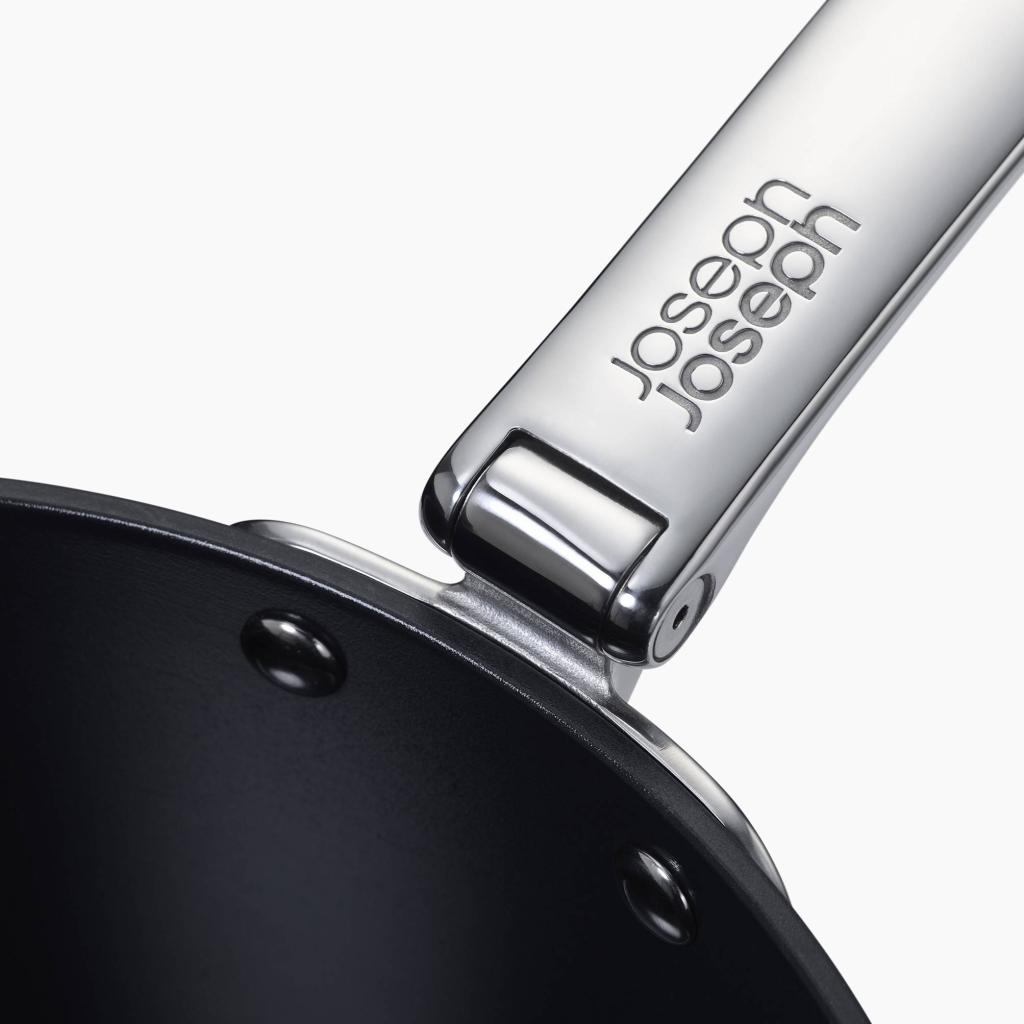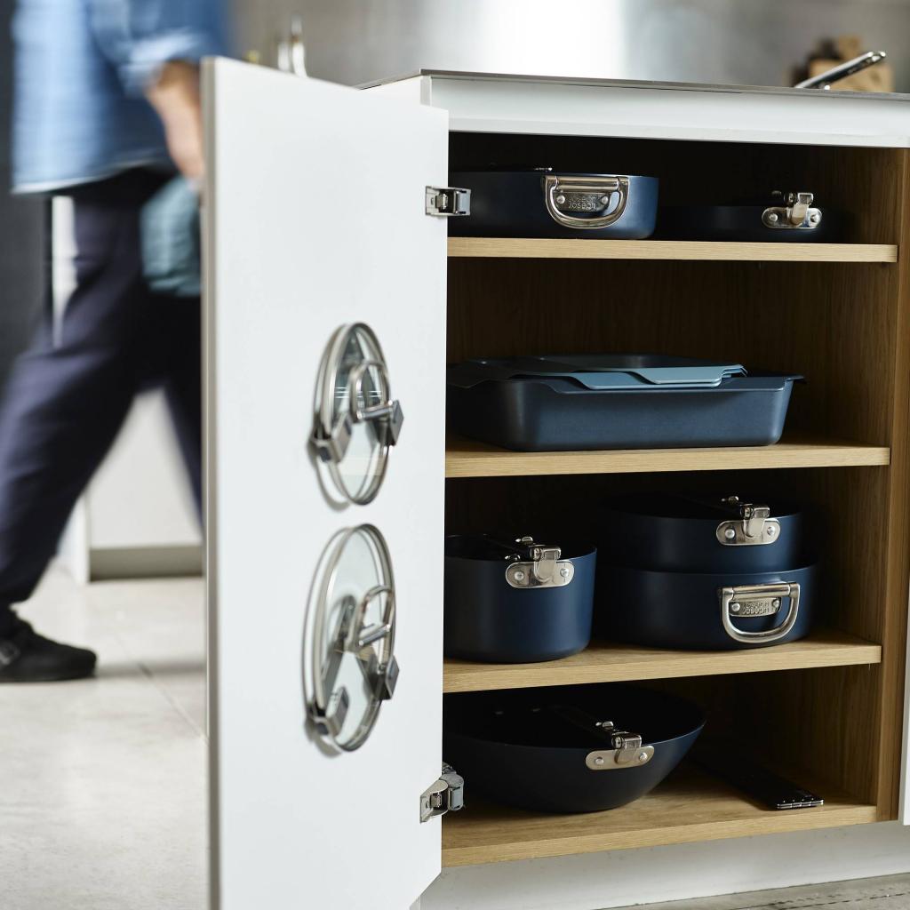 Pentole che comprendono le realtà della cucina moderna - Joseph Joseph SPACE. Durante la cottura, rimane stabile e sicura, pronta ad affrontare tutto, dalla colazione veloce alla cena improvvisata. Una volta arrivato il momento di riordinare, cambia carattere e si adatta discretamente allo spazio, senza occupare più posto del necessario. Cosa si può desiderare di più?