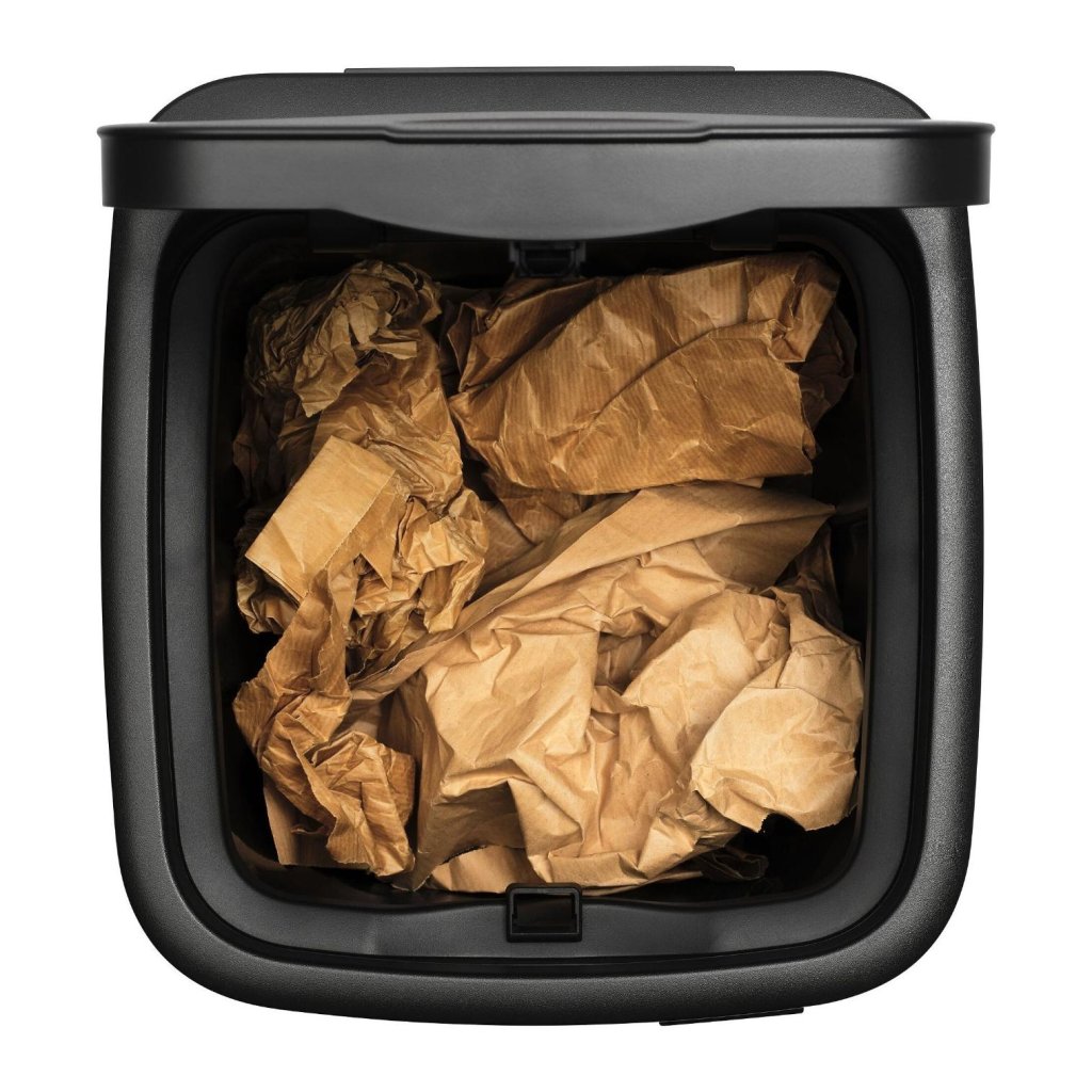- L'ampio ingresso per i rifiuti minimizza l'ingombro e riduce il rischio di fuoriuscite o versamenti quando si inseriscono rifiuti più grandi.