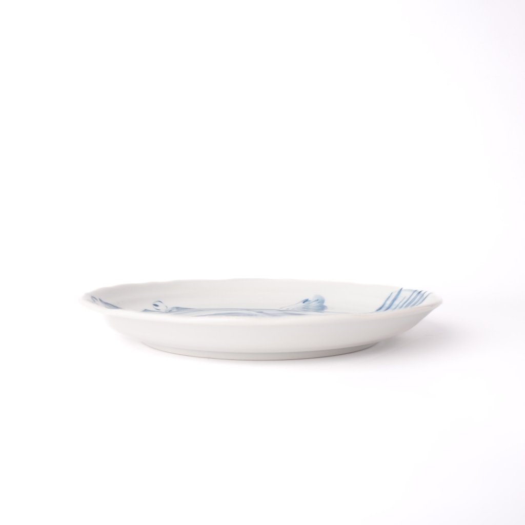 - Il motivo dipinto di blu su sfondo bianco aggiunge una sottile linea illustrativa a ogni piatto, che contrasta splendidamente con i colori degli ingredienti serviti.
