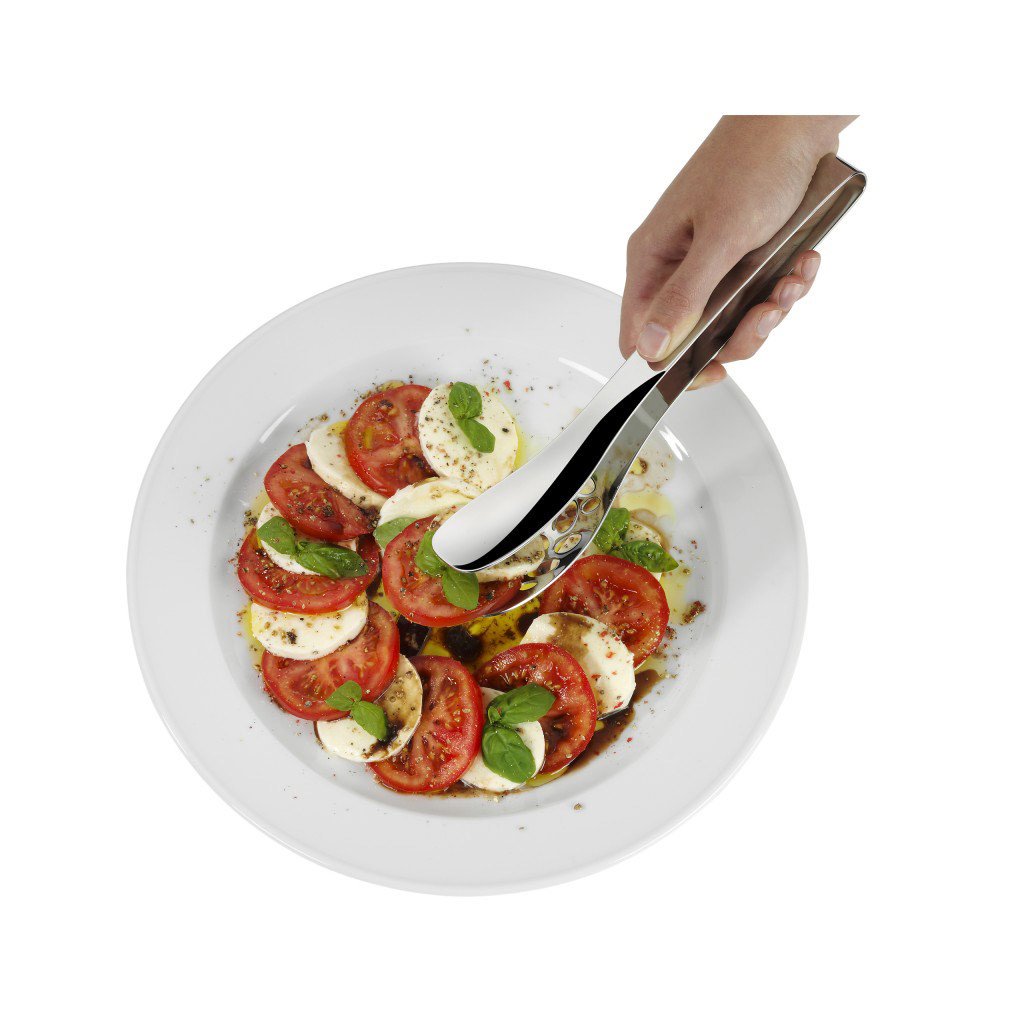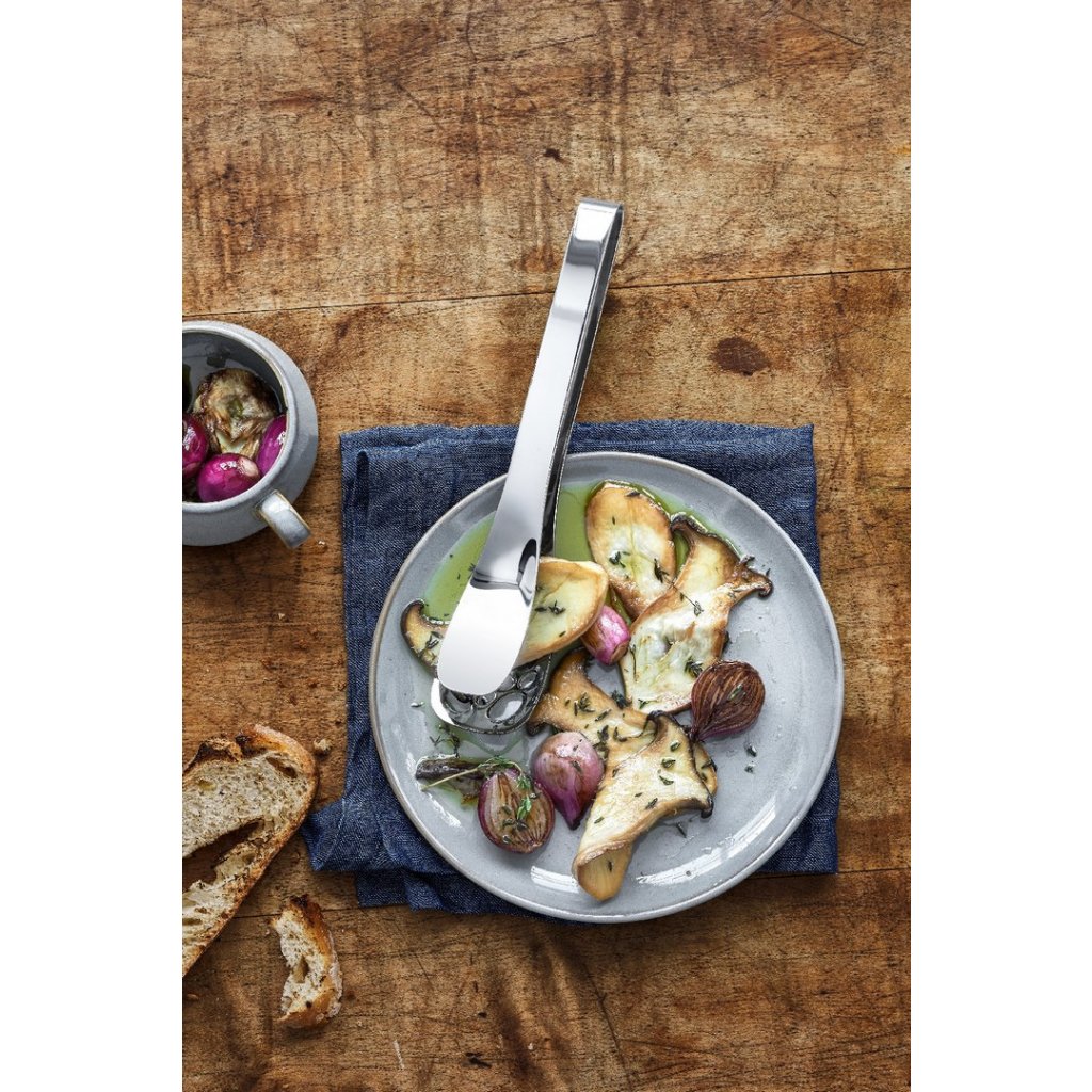 Le pinze da portata forate Nuova sono adatte per cucinare e servire. Il design ingegnoso assicura una comoda maneggevolezza. Grazie all'estremità larga, è adatto per servire patatine, noodles, asparagi, insalata, verdure e pesce. In cucina, li apprezzerete soprattutto quando girate la carne sulla griglia o la arrostite in una teglia.