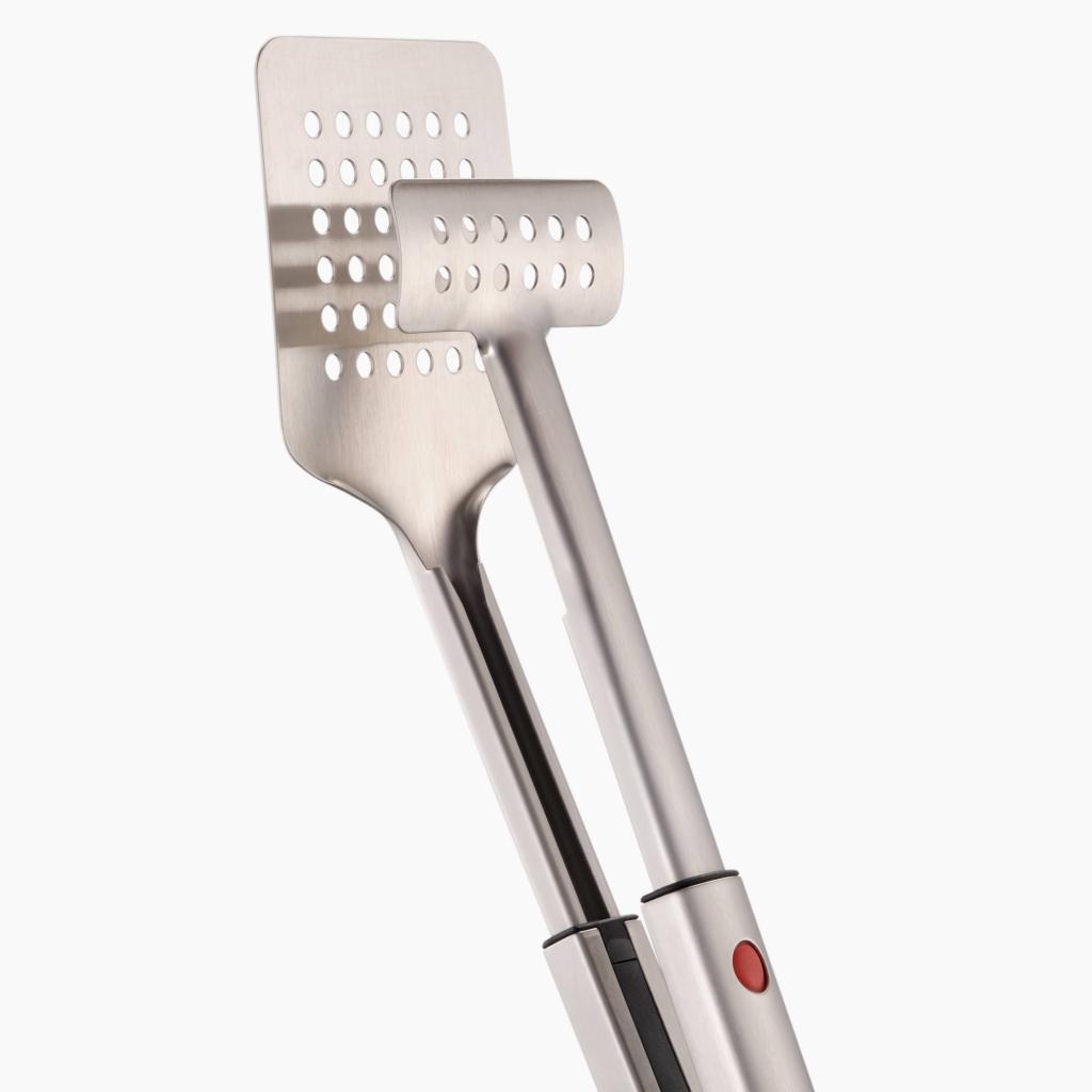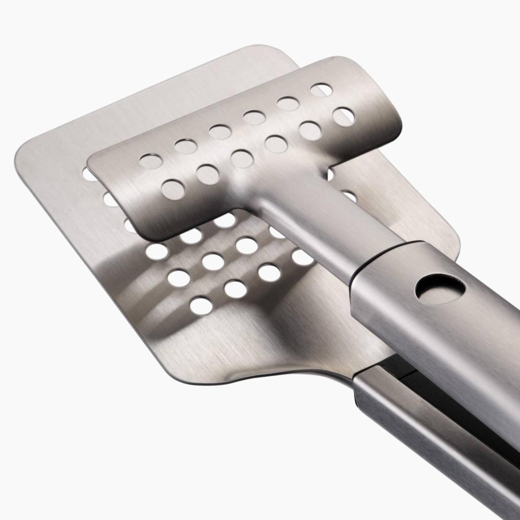 - L'esclusiva combinazione di pinze e spatola consente una presa salda sugli ingredienti e un comodo sollevamento con un'ampia superficie durante la manipolazione sulla griglia rovente.