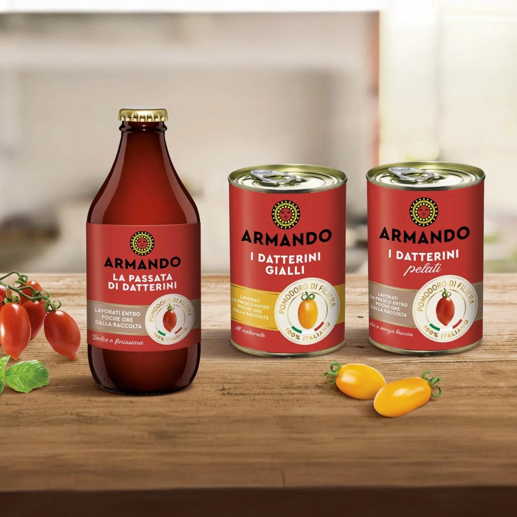 - Il design della lattina combina il rosso con gli elementi tipici del marchio ARMANDO e l'icona del pomodoro datterino, conferendole un aspetto chiaro e professionale.
