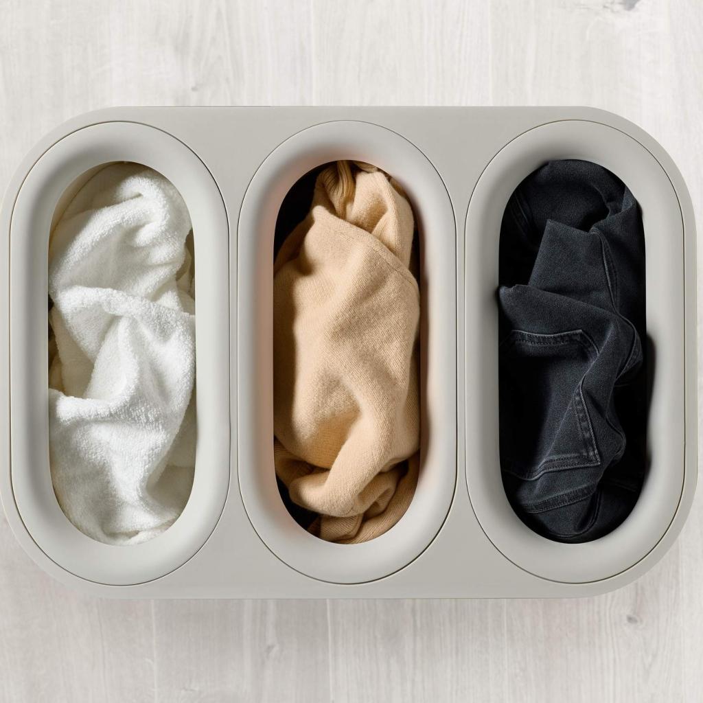- Portabiancheria Joseph Joseph TOTA TRIO LUXE in ecru è una soluzione elegante e pratica per la suddivisione del bucato in una casa moderna.