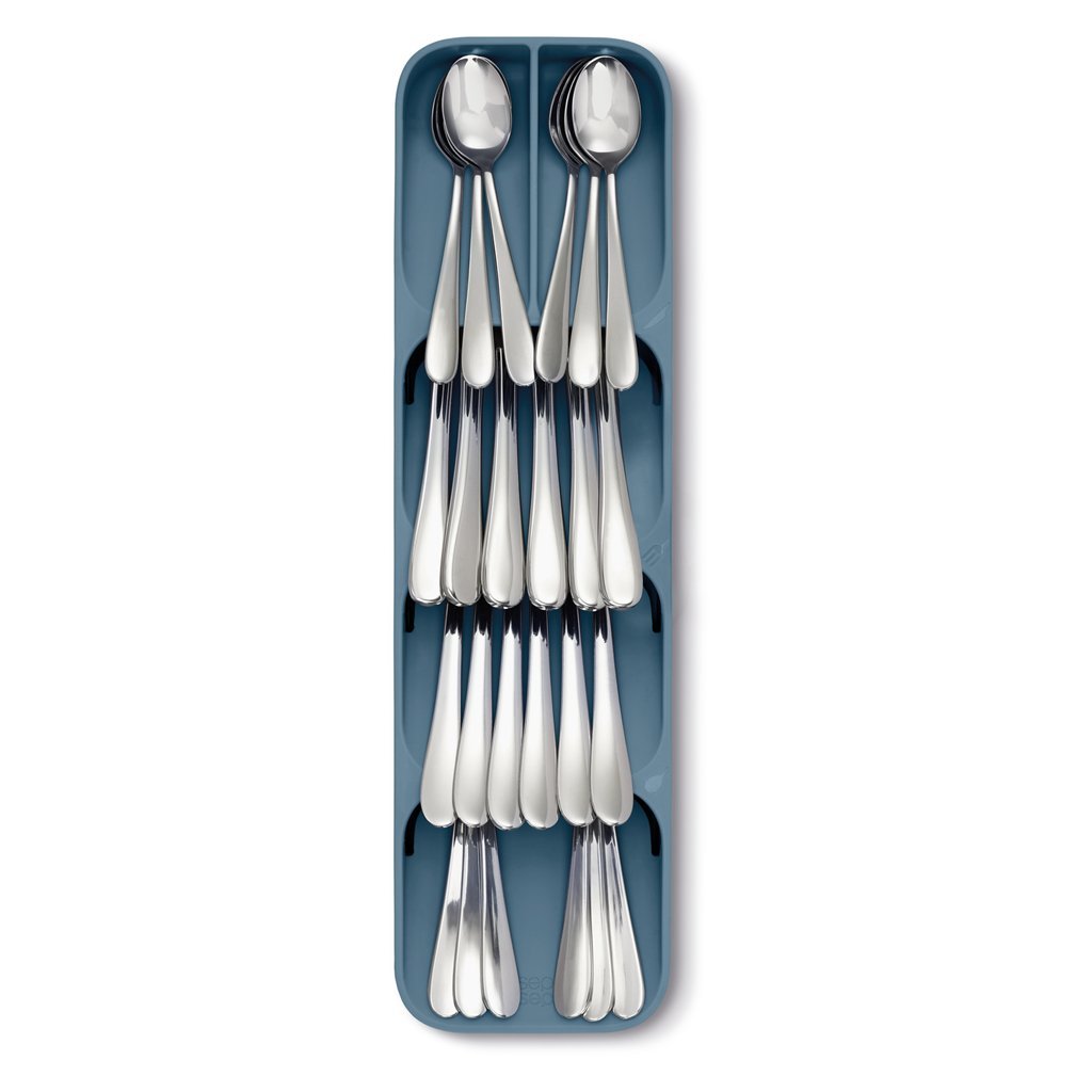 Riponendo le posate in posizione obliqua l'una sull'altra nel Cassettiere JOSEPH JOSEPH si risparmia più della metà dello spazio nei cassetti. È possibile inserire le posate nelle fessure contrassegnate su entrambi i lati. I piedini antiscivolo garantiscono la stabilità degli scomparti del cassetto. L'organizzatore può essere utilizzato in un cassetto con una profondità minima di 8 cm.