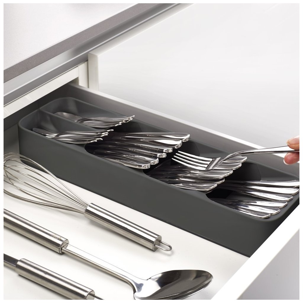 Il cassetto portaposate Duo di JOSEPH JOSEPH consente di risparmiare più della metà dello spazio. È possibile inserire le posate nelle fessure contrassegnate su entrambi i lati. I piedini antiscivolo garantiscono la stabilità degli scomparti del cassetto. L'organizzatore può essere utilizzato in un cassetto con una profondità minima di 8 cm.