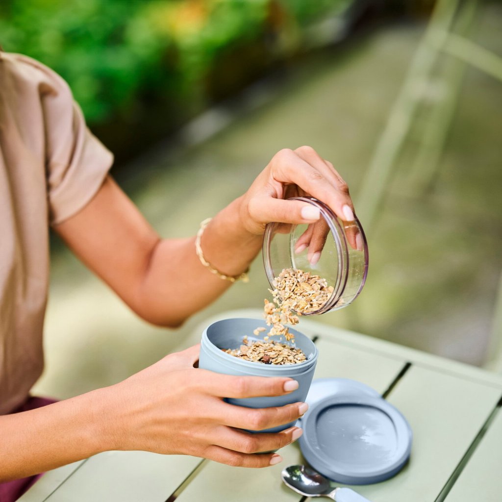 - il contenitore superiore trasparente da 120 ml può contenere circa 50 grammi di muesli, frutta o condimenti croccanti
