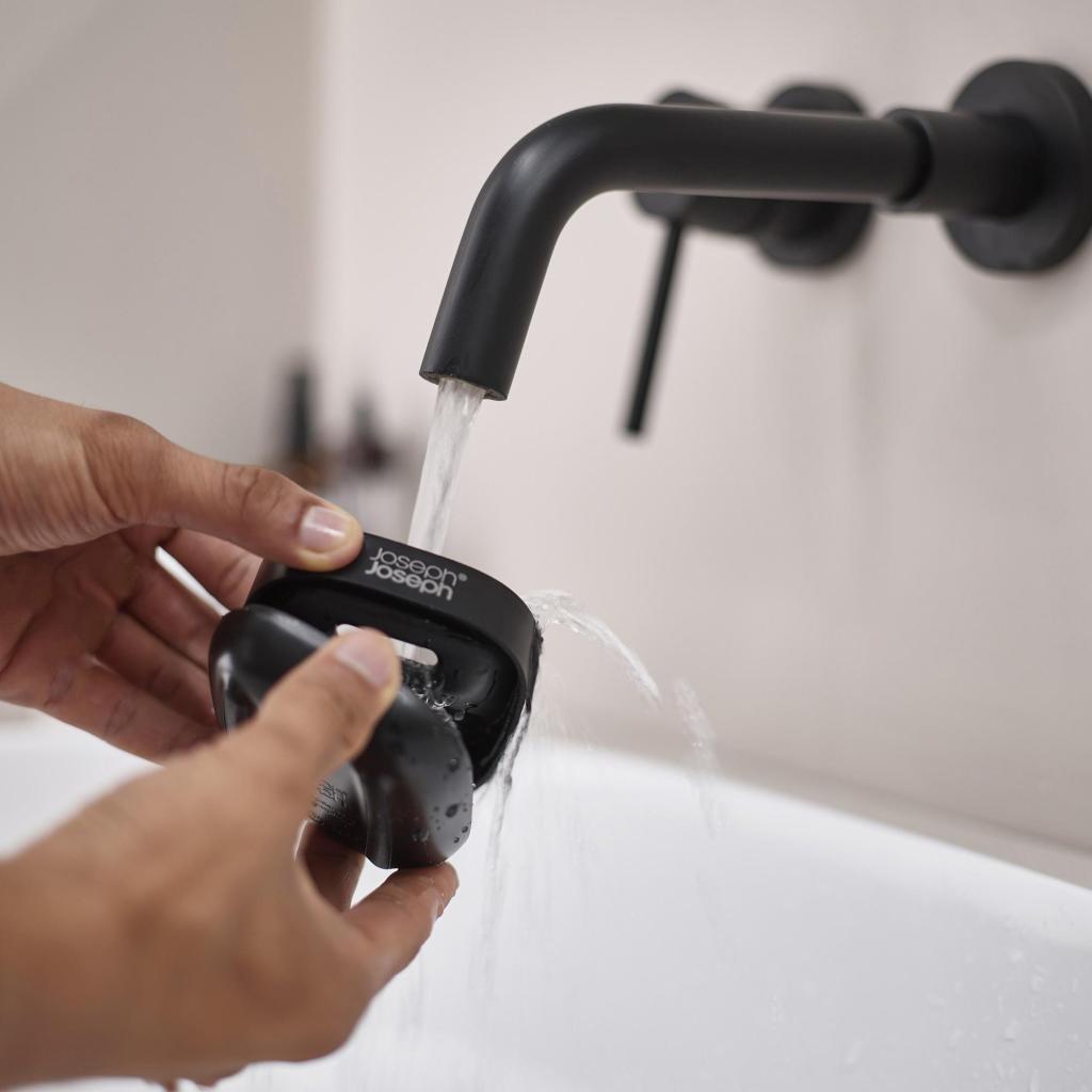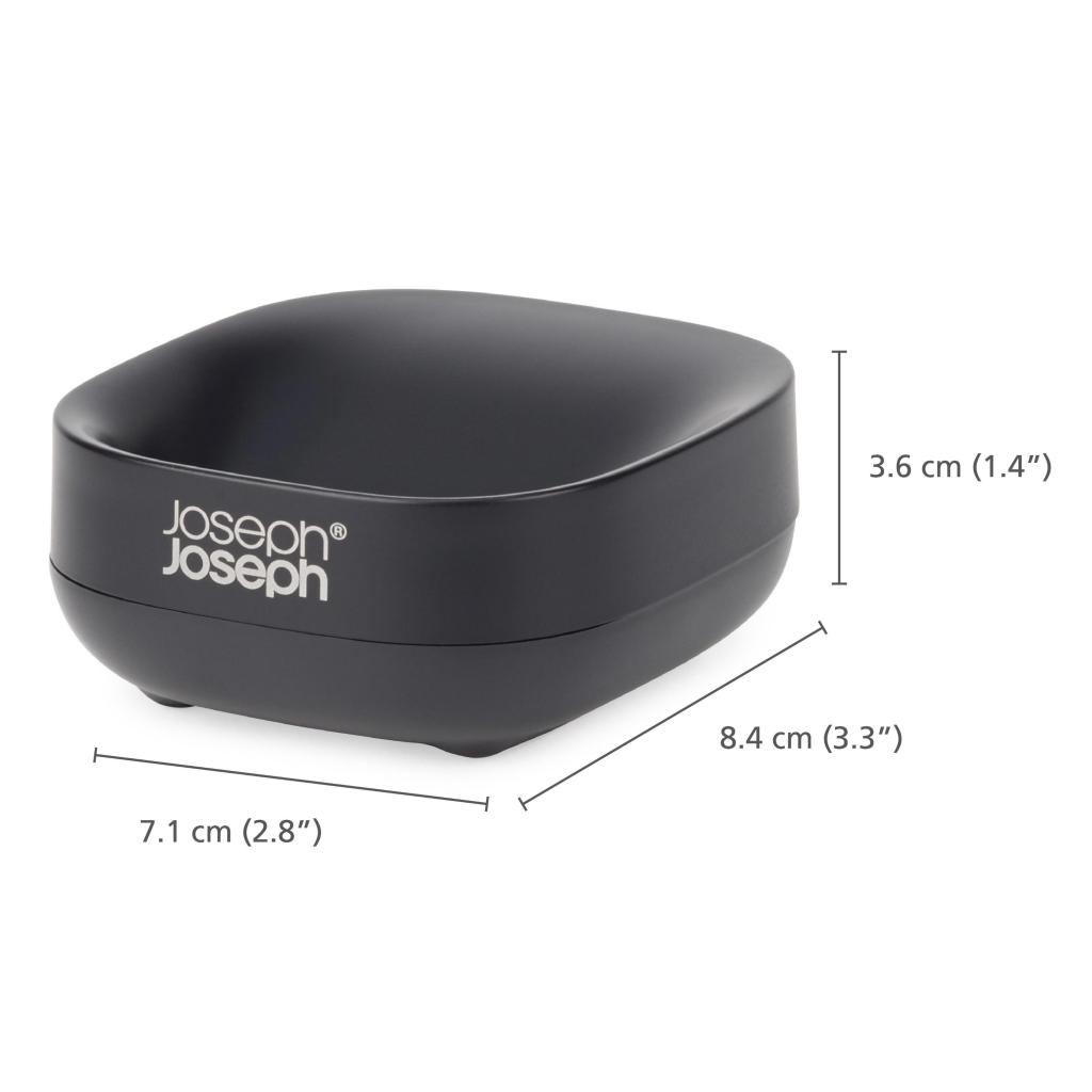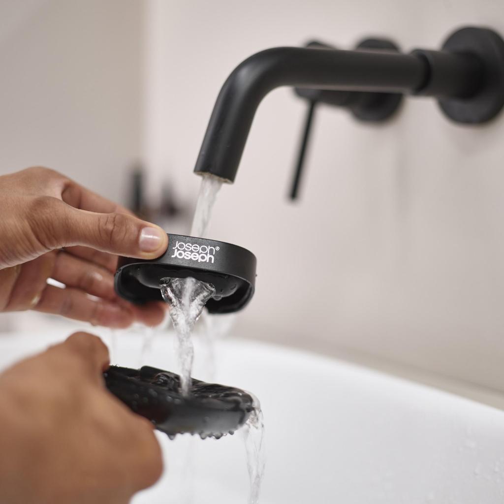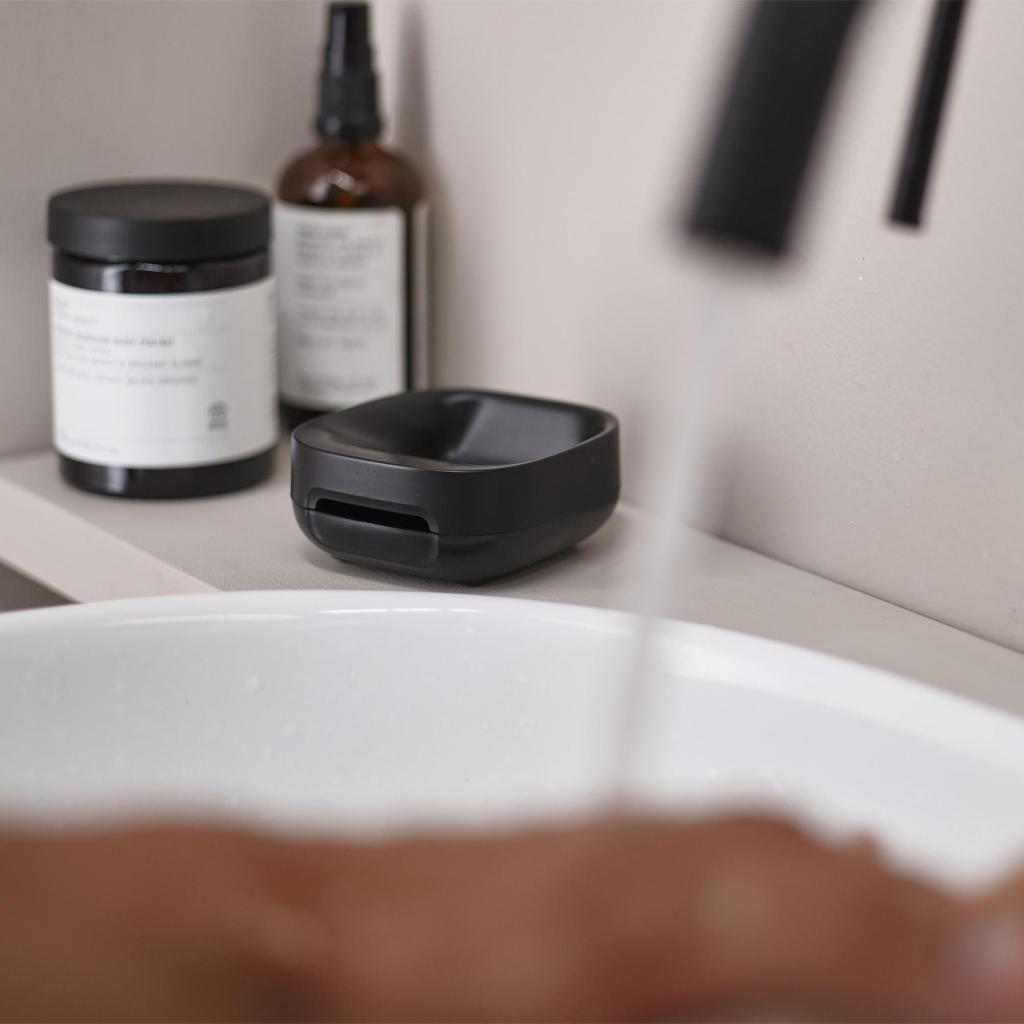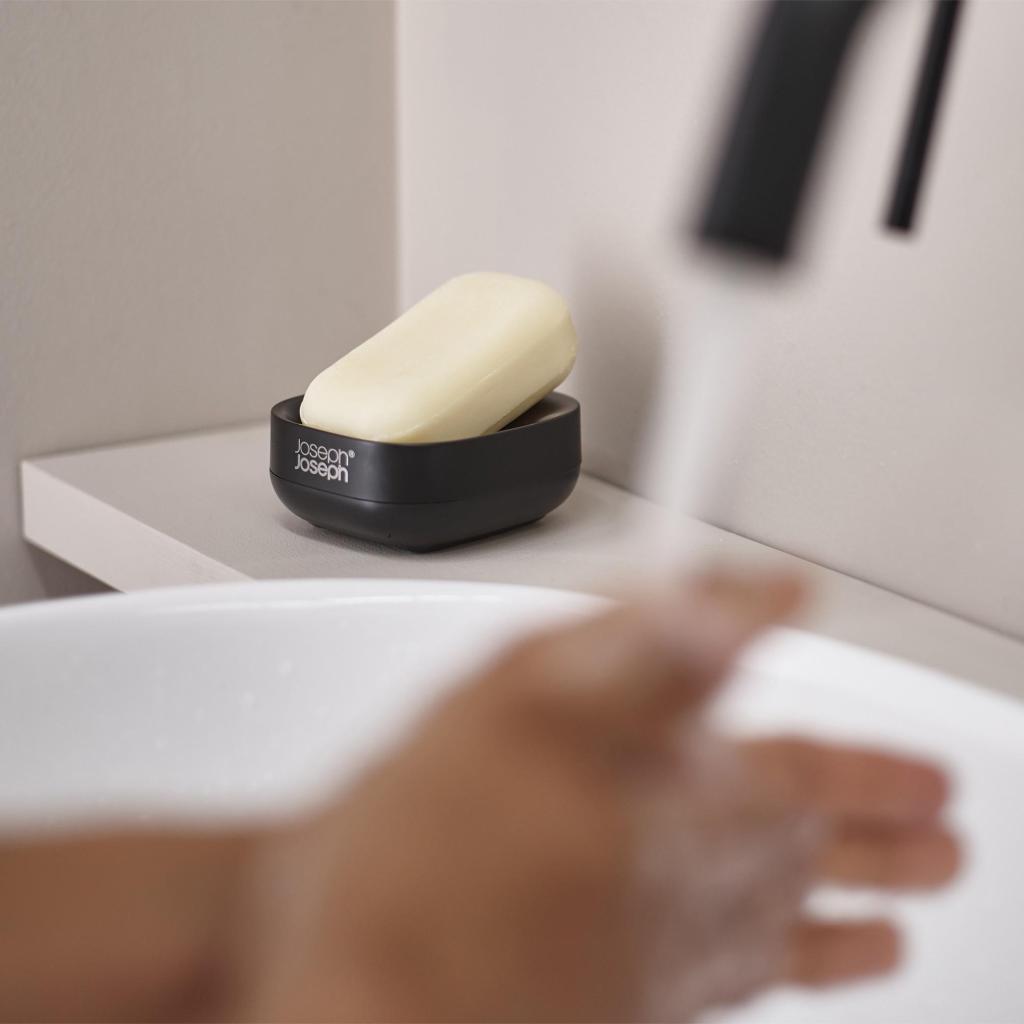 - Il portasapone compatto Joseph Joseph SLIM è progettato per occupare il minimo spazio vicino al lavandino, mantenendo il sapone asciutto grazie a un attento design inclinato.