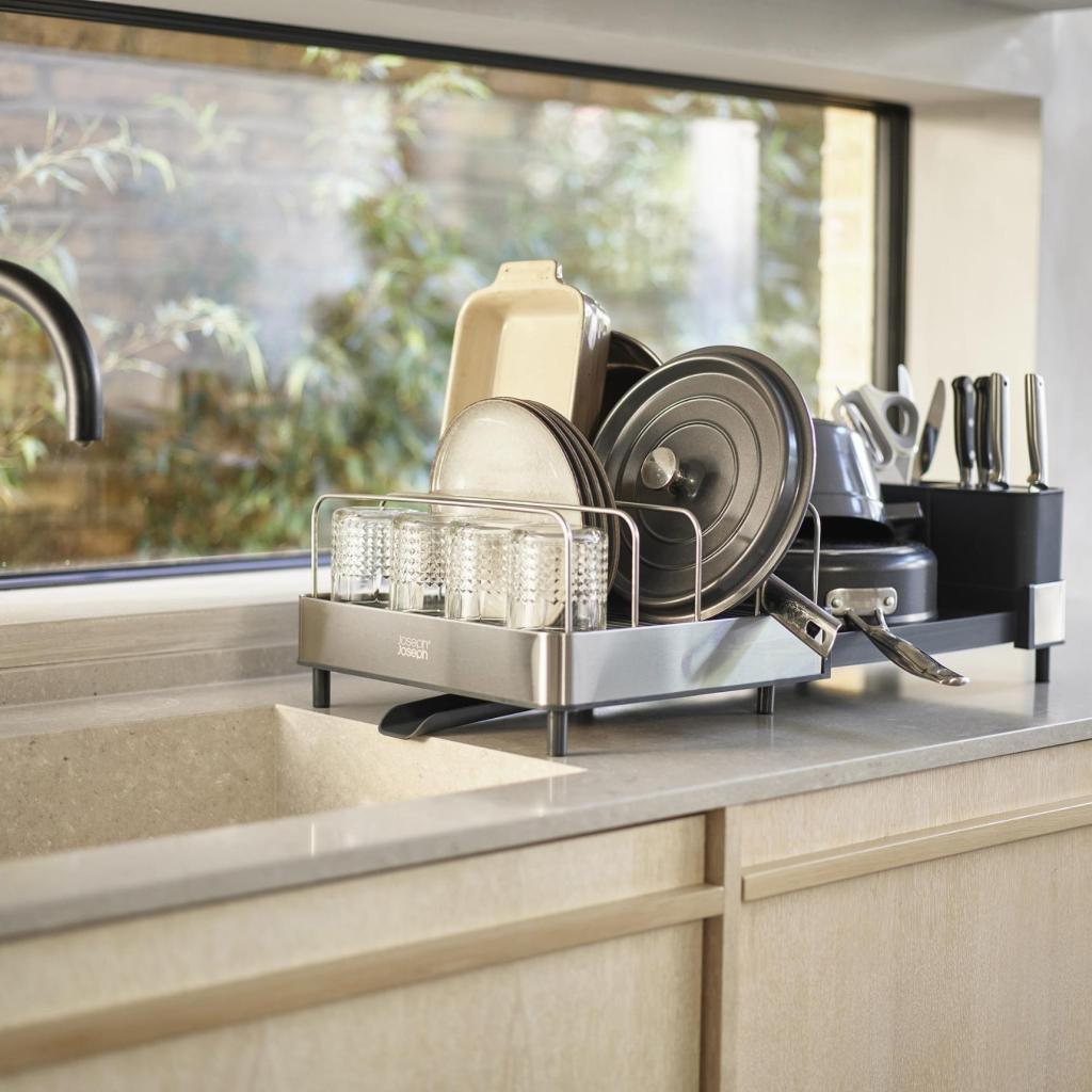 - Joseph Joseph EXTEND MAX è un pratico accessorio da cucina che offre spazio flessibile per asciugare le stoviglie, contribuendo al contempo a mantenere ordinato il piano di lavoro.