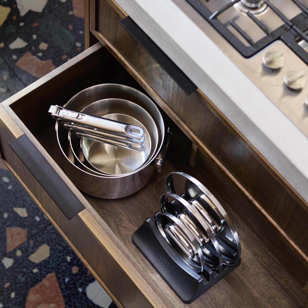 - Il pratico portacoperchio pentola può contenere fino a tre coperchi e aiuta a mantenere un'organizzazione ordinata all'interno della credenza della cucina.