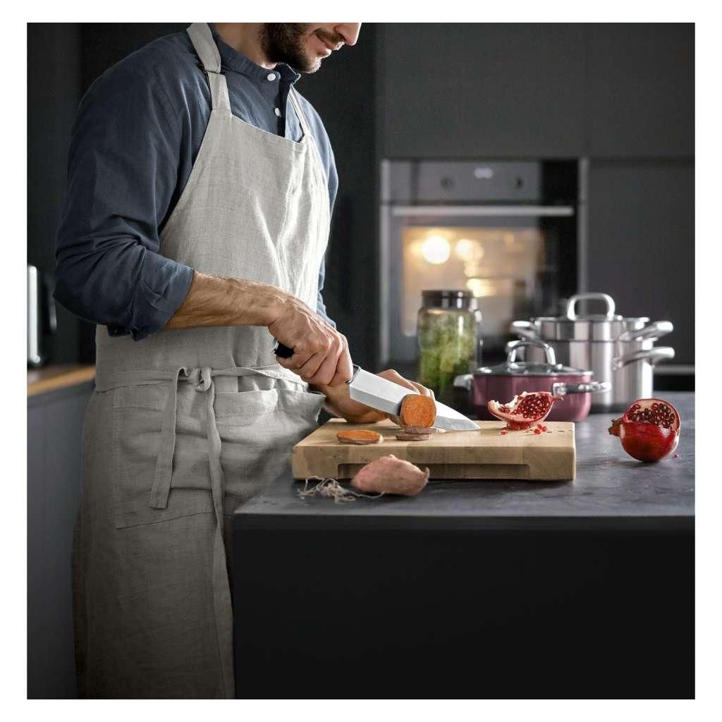 Il coltello da chef con lama lunga 20 cm vanta una lama ampia e resistente che consente di gestire facilmente carne, pesce e le verdure più dure. Ma si può usare anche per lavorare le erbe o tritare le noci: basta appoggiare la punta del coltello sul tagliere e muovere la lama su e giù.