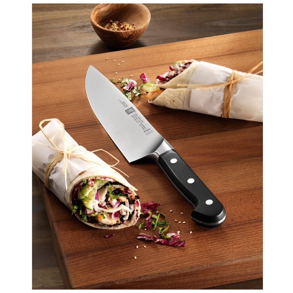 Il coltello da chef ZWILLING® Pro è un coltello robusto e resistente, con una lama larga dal bordo sottile ma durevole. Un tuttofare per professionisti e cuochi per hobby che pulisce le verdure ma anche taglia le erbe o le costolette.