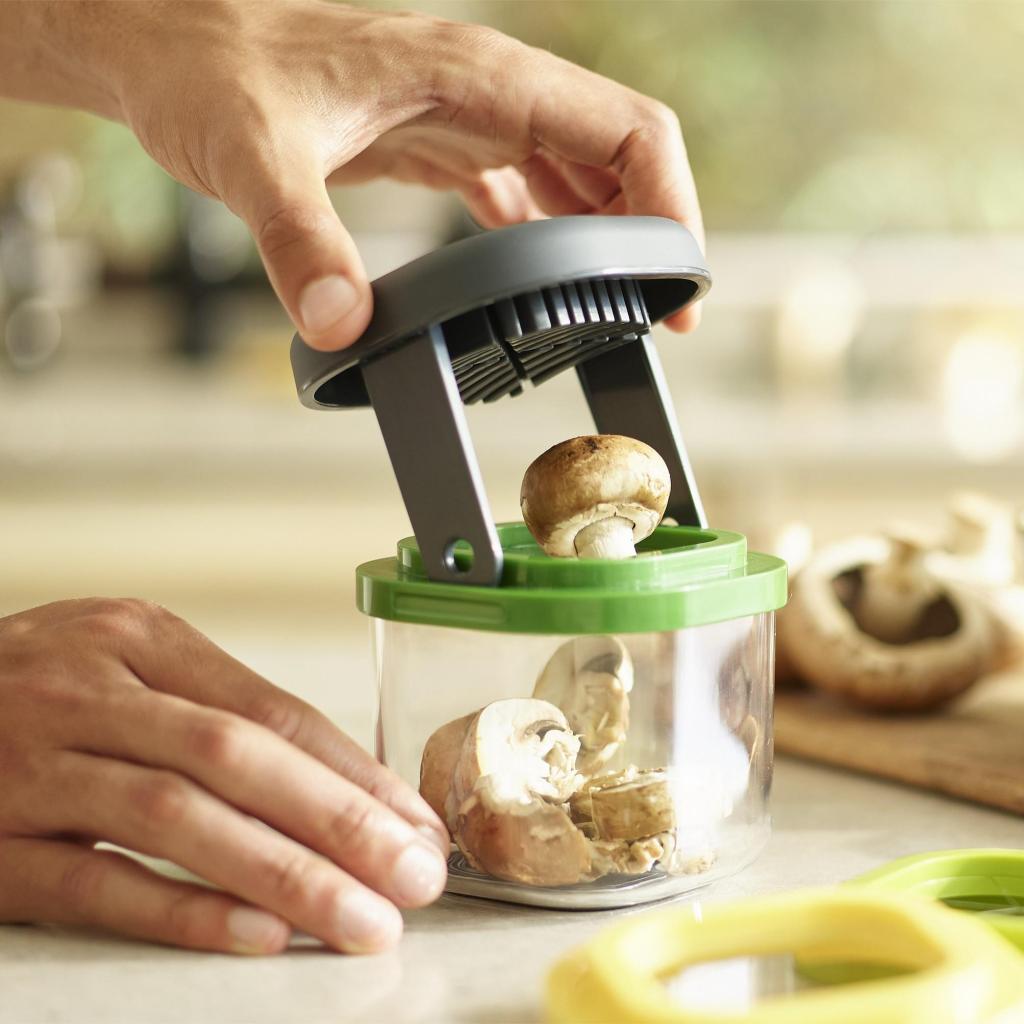 - Il pratico contenitore funge da raccoglitore, in cui cadono gli ingredienti tagliati, mantenendo così pulita la superficie di lavoro durante la preparazione del cibo.