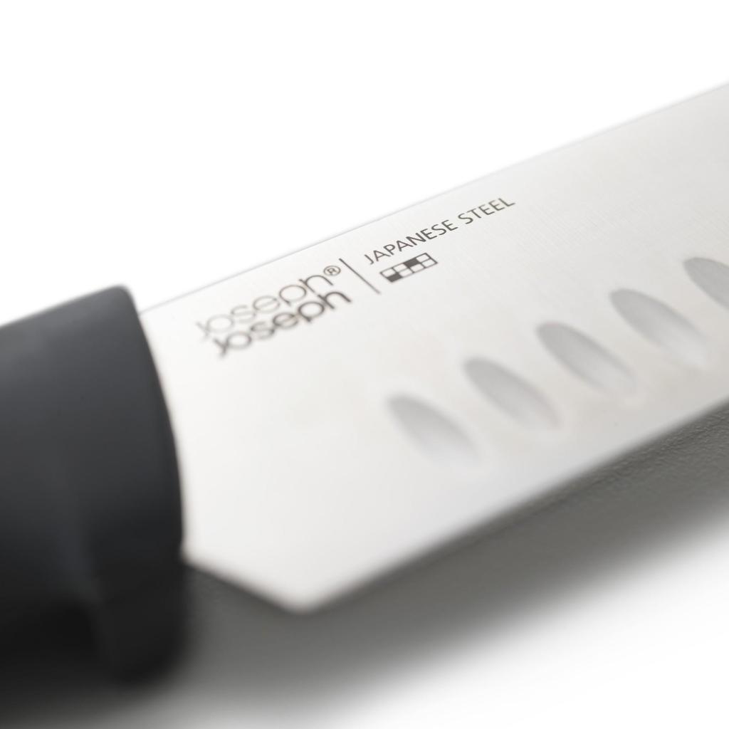 - I coltelli nel set includono un coltello da pelare con una lama lunga 9 centimetri, un coltello seghettato con una lama lunga 11 centimetri, un coltello santoku con una lama lunga 14 centimetri e un coltello da chef con una lama lunga 16,5 centimetri.
