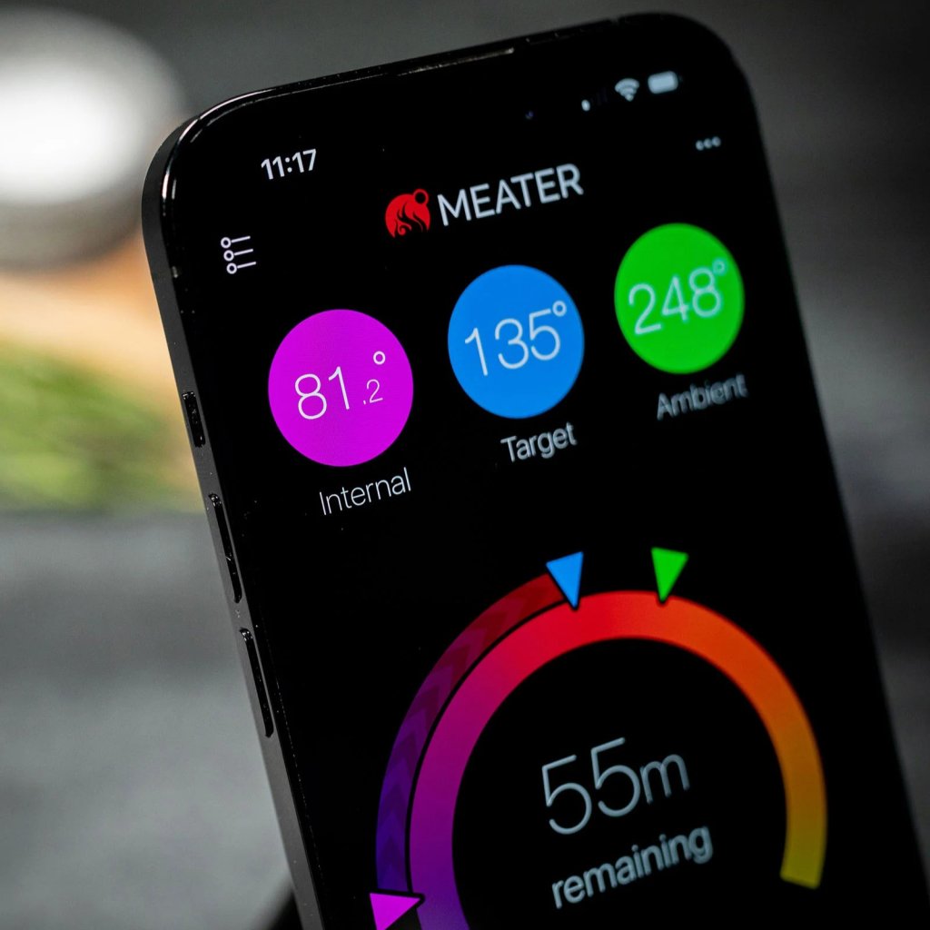 - L'app Meater (per iOS versione 15 e successive, per Android versione 8.0 e successive) monitora la cottura e ti consiglia cosa fare (è necessaria per il funzionamento del termometro)