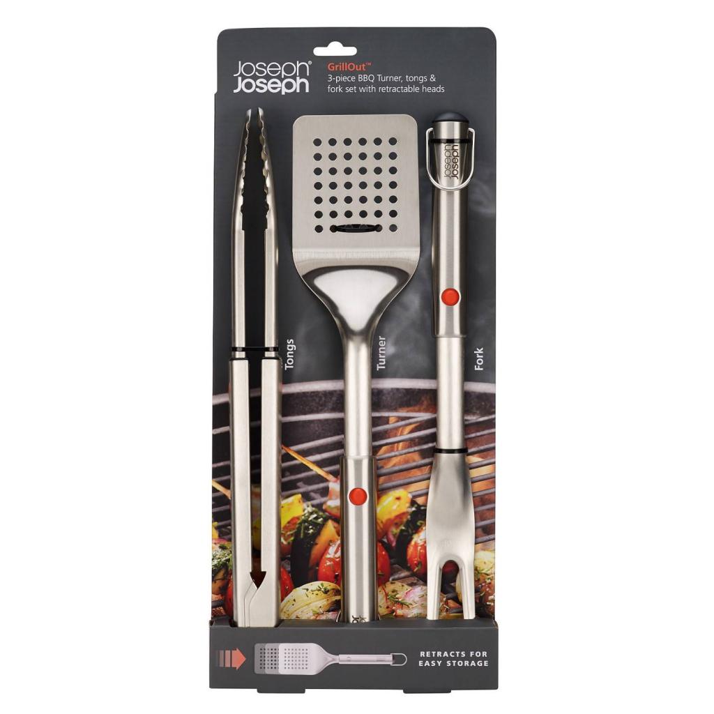 - Il set per griglia Joseph Joseph GRILLOUT comprende una forchetta, una paletta e delle pinze in acciaio inox per una manipolazione completa del cibo durante le grigliate all'aperto.